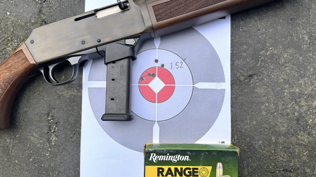 Besides accuracy, I also shot the Henry Homesteader in a practical capacity. I put up a TruGlo Gunslinger target that has a reduced-size “bad guy” silhouette, with scoring rings. Loaded my PMag 21-round Glock magazine with 20 rounds of mixed test ammo, and inserted it into the Homesteader mag well. Then chambered a round and applied the tang safety.