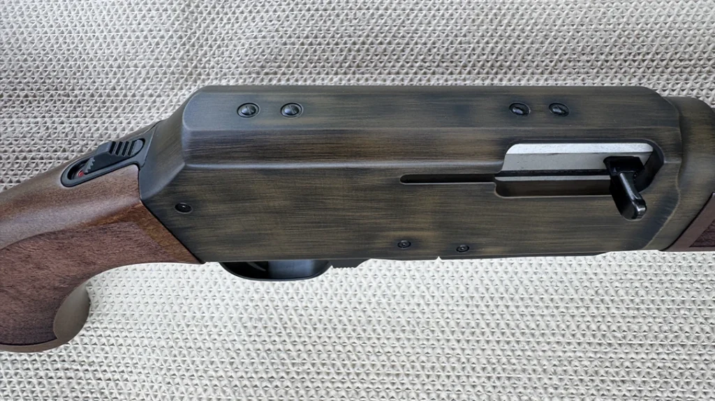 Henry’s newest Homesteader variant replaces the blued-steel with a brushed bronze Cerakote finish. This finish provides an additional degree of ruggedness and durability compared to the basic blued steel finish. Besides looking good, the finish’s ceramic-based formulation has a reputation for resistance to wear, corrosion, chemicals and extreme temperatures. All metal surfaces of the Homesteader wear this modern finish. The furniture remains American Walnut.