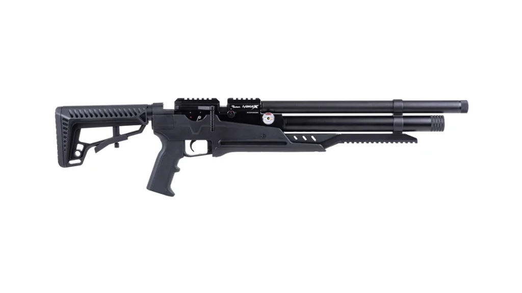 The AvengeX repeater from Pyramyd Air follows the legacy of the company’s popular Avenger air rifle. This adult air rifle is available in .177, .22, and .25 calibers. It also has some modularity built in, as it is designed to allow easy swapping of the receiver to another stock style. This includes options like the Avenger classic wood stock, a bullpup stock or even a tactical stock. AvengerX air rifles are outfitted with a two-stage adjustable trigger that helps improve accuracy. Their receivers include 11mm dovetails that make scope mounting straightforward. The rifle is pressurized via interchangeable air bottles that can charge up to 4,350 psi. Bottle sizes for the AvengerX are offered in 210 cc “tubes” or 390 cc carbon-fiber tanks. According to the manufacturer, the AvengeX has the power and accuracy to perform effectively out to 100 yards. MSRP starts at $500.