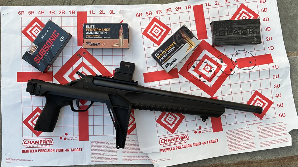 A 100-yard zero was chosen, considering the role envisioned with the Rossi LWC and Meprolight MPO Pro-F red dot sight. A 3x magnifier was used to improve the sighting-in process. Roughly speaking, a 100-yard zero with 110-125 grain .300 BLK loads drop only -2-3 inches by 150 yards and 8-9 inches at 200 yards. Clay pigeons were easily broken out to 130 yards. You can judge if a 200-yard zero is more practical for your situation or optic choice. If a user wants to zero for subsonic loads, the trajectory is surprisingly flat out to 50 yards. 100-yard bullet strikes were approximately 8 inches low with the 50-yard zero.
