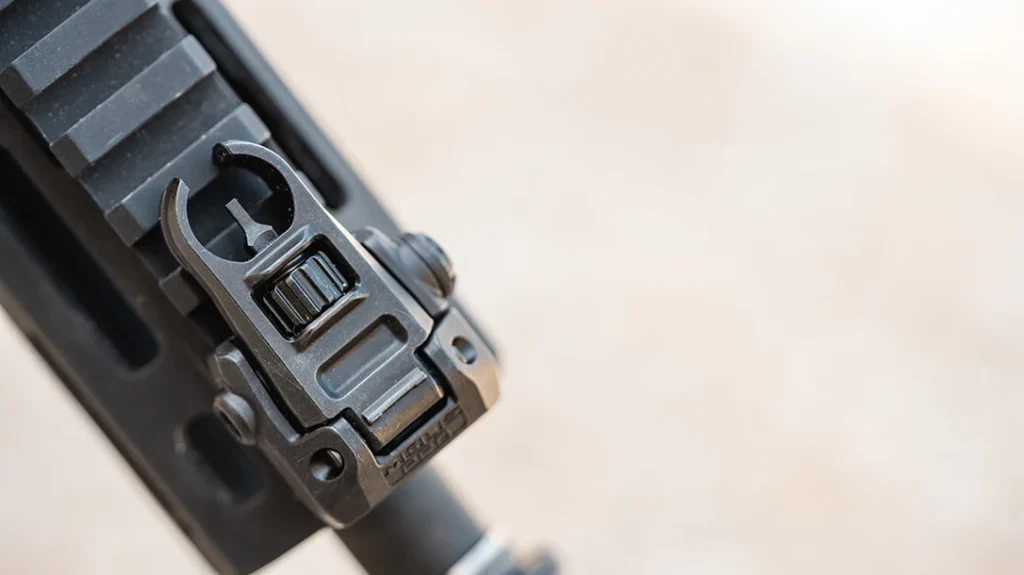 Stowed, this sight only hogs 1.71″ of rail. When deployed, it sits at standard AR sight height (0.432″ above the rail), so it integrates cleanly with your existing sighting system. Its all-steel build and corrosion-resistant QPQ finish keep it tough in the elements — no surprise there, this is full Magpul DNA.
