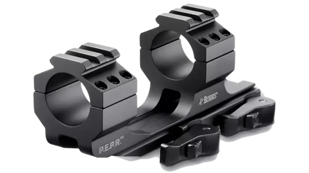 One of my favorite mounts produced by Burris is the AP-Proper Eye Position Ready (P.E.P.R) also known as the Pepper. With two inches of offset to obtain crucial eye relief, the P.E.P.R is available in 1 inch, 30mm and 34mm. Burris also offers the P.E.P.R. quick detach model for one inch and 30mm configurations as well as a 34 mm model with built-in 20 MOA slope for longer distance shooting. The PEPR also features additional auxiliary rails atop the rings.