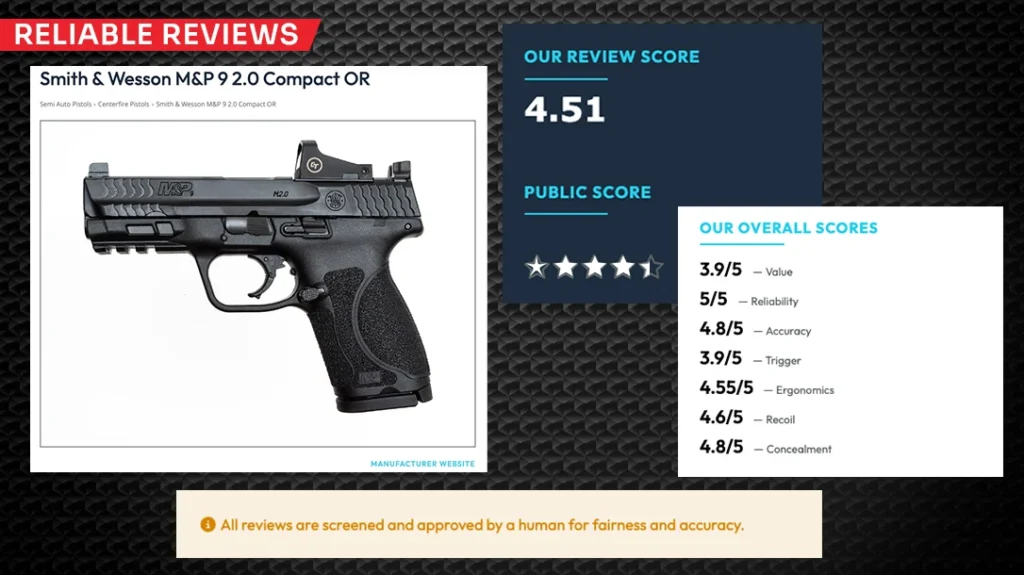 Each firearm starts with an expert review from one of our vetted, battle-tested writers. The folks who actually know how to run a gun and tell it straight. Then, readers like you can jump in, register, and drop your own review. Every opinion counts, and all those user scores roll up into one community-driven rating that helps others decide if a gun’s a hit or a total dud.