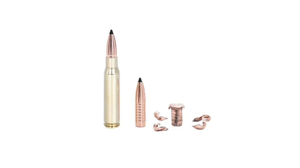 In the process of tearing away from the bullet base, the petals “bloom.” The outside diameter ends up growing and carves a much larger, more ragged, wound channel. On game, the exit wound can drive increased blood loss. Typically, the base of a .30 caliber bullet will expand to .40 caliber.