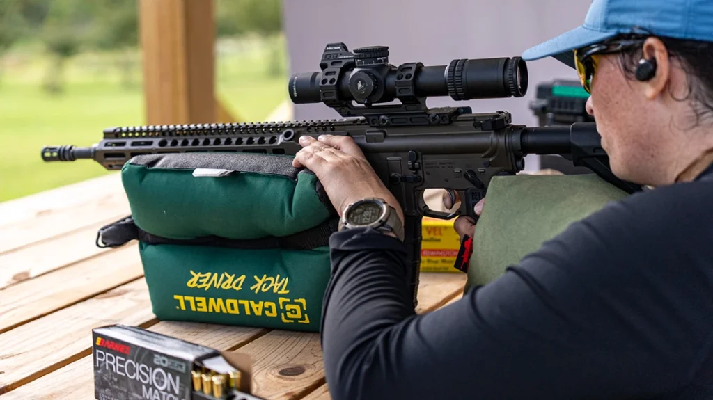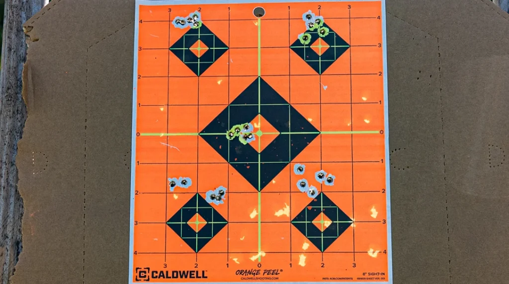 Midwest Industries built its rifle around the 16-inch Criterion Core Barrel, a high-quality barrel renowned for its exceptional performance and accuracy. I selected five loads of ammunition known to be accurate and precise to test through the rifle. Caldwell recently sent me the Lead Sled DFT 3 shooting rest, which I’ve been using for long gun accuracy testing. The frame features a sliding design, allowing you to adjust it to accommodate the length of stock you have. Using the knob in the rear, you can raise or lower the stock height until you’re on target. Using the wheel in the front, you can adjust left or right to point the muzzle in the precise location. With the rifle secured in the Lead Sled, I put up an Orange Peel Sight-In Target with five bullseyes to perform my ammunition testing.
