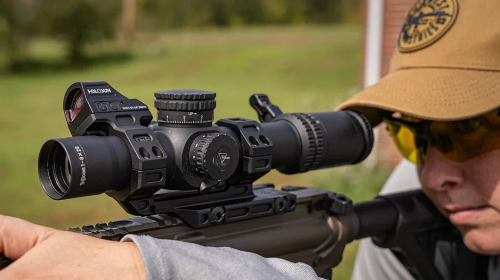 The Trijicon Credo 1-8x scope has proven to be indestructible so far, and I’ve been using it for almost a decade now in competition. My scope has been beaten up from slinging my rifle to throwing my rifle in dump barrels. It’s never lost zero, and the illumination still works perfectly. The MIL reticle is simple and easy to understand with adjustable turrets for windage and elevation. You screw off the scope caps and reposition to 0 once you have your rifle zeroed.