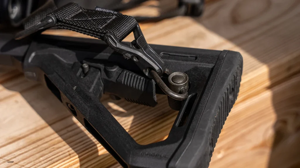 If you’re looking for a quality sling, I highly recommend the Magpul MS1 QDM sling. It is already set up with two QDM quick-disconnect swivels. The slider stays in place until you physically pull to slide it to lengthen or shorten the sling. Finally, the Combat Rail HD Handguard features a full Picatinny rail for mounting a pressure switch for a light, for example, or other accessories.