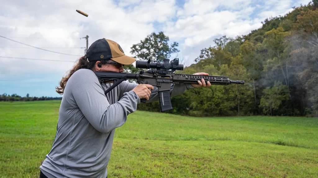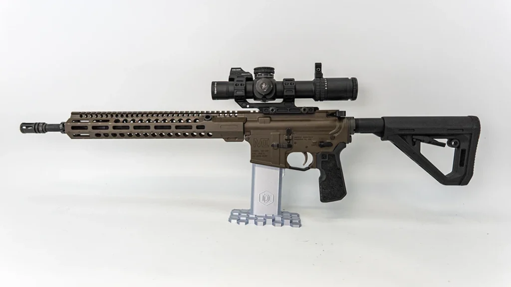 I used the MK2 QD 34MM Scope Mount in the standard configuration, but it is also available in a high configuration. I mounted the Trijicon Credo 1-8x riflescope and the Holosun 407k red dot optic at a 45-degree angle using the Midwest Industries MK2 RMR 45 offset scope ring cap. There is a purpose to having both a scope and a red dot optic on a rifle. I always zero my primary optic, in this case, a scope, for 100 yards and the offset for 7 yards. This allows me to quickly neutralize close-range targets by aligning the red dot optic with the target and then easily return to the scope to shoot long-range targets.