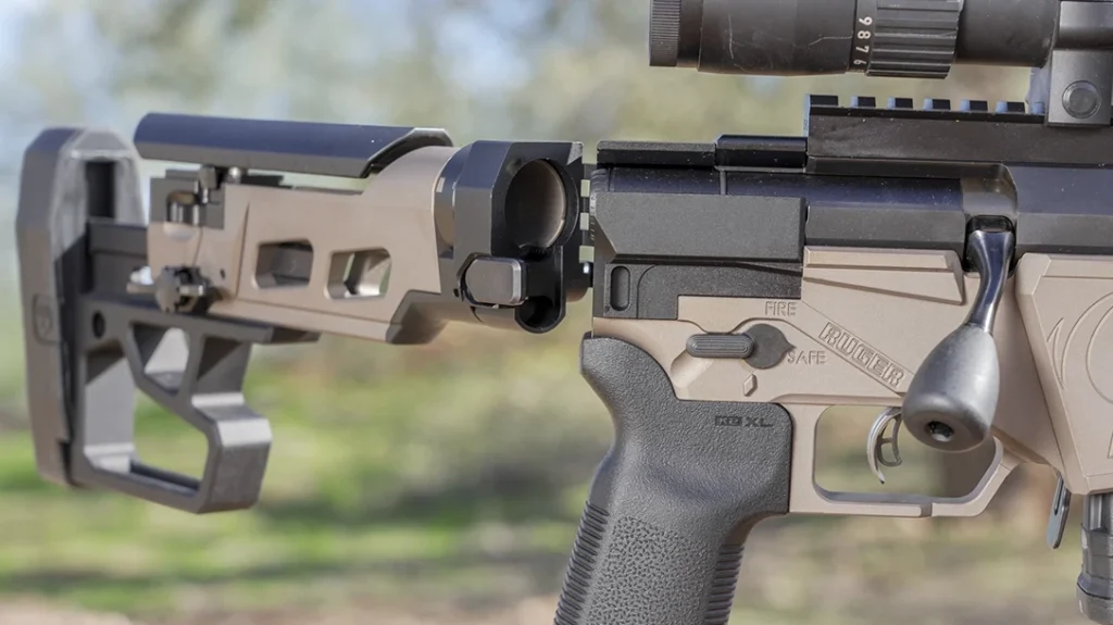 I’m happy to say that initial run through of this now Gen 3 RPR is a good one. No—great one. At first glance and handling I really like this rifle. It’s clear that Ruger hasn’t slept on this rifle and has continued to quietly refine it over the years. It shows up this year in a gorgeous FDE/bronze color with all the right attachment points up front. M-Lok, dovetail—and I’m ecstatic to report a butt stock with amazing adjustability that is easy to use and secure without a bunch of weird knobs. It’s very clean in fact and this makes me happy. It’s clearly a refined and retouched rifle and performance showed too.