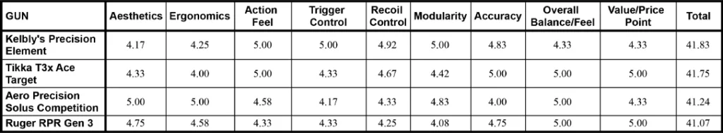 The Solus is getting long in the tooth but not too long. It’s placement and appearance in this match up shows just how phenomenal this rifle truly is. Aero has a real winner on their hands and with some massaging and refinement it could be a world class rifle much like Tikka’s are.