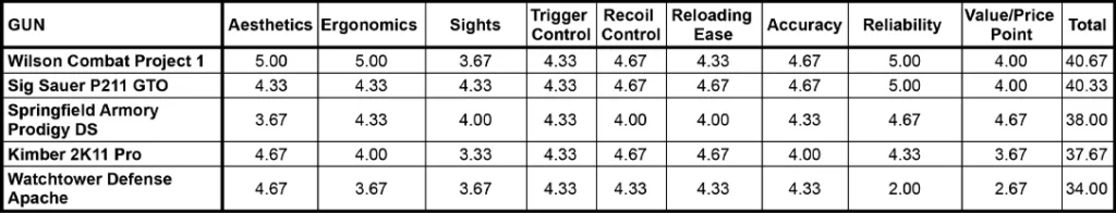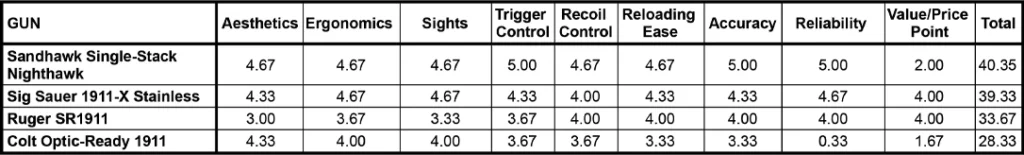 Now, let’s break down the contenders. Each received a deep dive, scored on a 0-5 scale across nine categories, allowing for a potential total of 45 points maximum. The categories were Aesthetics, Ergonomics, Sights, Trigger, Recoil, Reloading, Accuracy, Reliability, and Value. Each firearm was explicitly evaluated for its performance during our range time that day. There were a few minor hiccups, but overall, we found them to perform well, with a few that edged ahead.