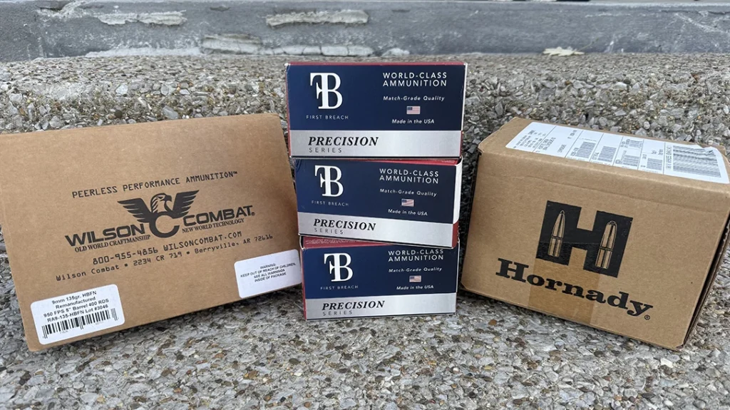 Fueling our test were donations from three ammo providers, a huge thank you for their generosity. Wilson Combat supplied 9mm 124-grain flat-point match-grade loads. Hornady provided the Critical Defense 9mm 115-grain FTX, Critical Defense Lite 9mm 100-grain FTX, and 45 Auto 230-grain XTP Subsonic. First Breach Ammunition, a newer veteran-owned component and ammunition producer based in the U.S., contributed 9mm 124-grain FMJ match-grade rounds.