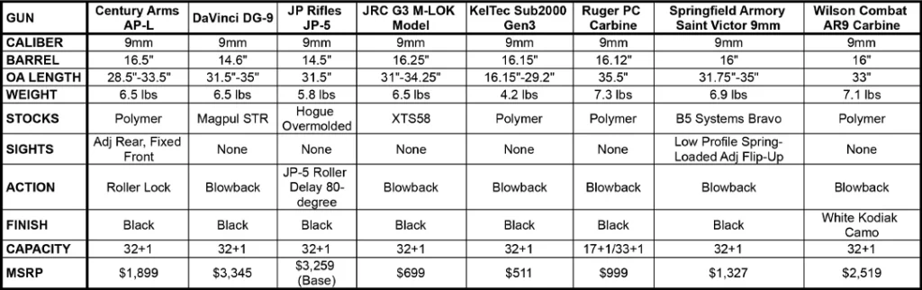 It is time to talk about the real stars of this roundup, the PCCs themselves. At my request, all were provided in 9mm, although the JR Carbine, Keltec Sub2000, and Ruger PC Carbine are available in other pistol calibers and some of the other guns were available in rifle calibers too. All of them had 16” barrels; no pistols or arm braces were allowed. All were tested with the same ammunition and in the same conditions although the DaVinci DG-9 was supplied with some specially loaded ammunition that the gun is specifically tuned to run the best.