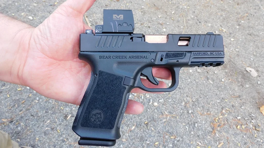Bear Creek Arsenal’s BC-102 Grizzly is a Glock 19 clone with some surprisingly nice features. The ported slide reduces weight, and the barrel is available with different finishes. They sent us the rose gold barrel, which does look pretty good. The company’s “Bear Fur” stippling is very effective, and the gun’s slide serrations make it easy to run the action. One mark against the Grizzly is that the slide release is so stiff that it’s mostly unusable.
