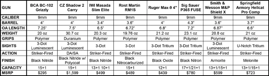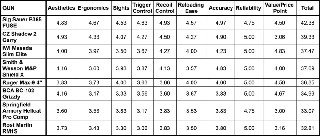 Perceived value in an inflated economy was front and center in our minds, and we feel the top-scoring guns deserve mention. The Bear Creek Grizzly, IWI Masada Slim Elite, Ruger Max 9, and Sig P365 FUSE all had aggregate scores of 4.5 or higher in that category. All the aggregate category scores, plus the final score, are included in the accompanying chart, which lists the gunsin order of their final placement.