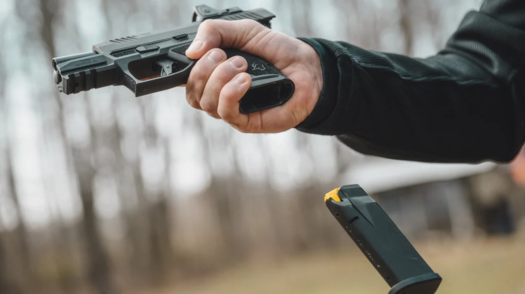 Magazine changes were done for the dual purpose of getting the feel of manipulating TX9 and verifying how quickly it could get back on target. Speaking of magazines, Taurus’s attention to detail is found here, too. The Taurus-designed metal magazines are manufactured by Mec-Gar. The TX9 magazines are double-stack bodies that transition to single-round exposed on the follower for feeding reliability. There is word that 19-round magazines will be coming online soon for the TX9 family. Along these lines, the longer/higher capacity magazines will work in the smaller frame TX9 models, extending out of the bottom of the grip.