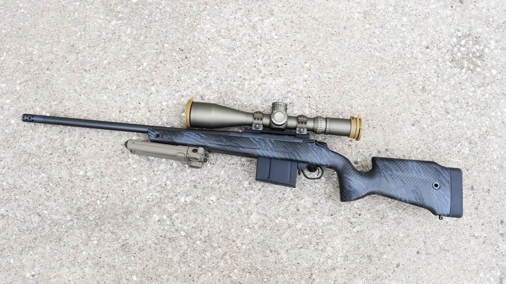 I mounted a Nightforce ATACR 7-35×56 F1 on the B14² Crest Carbon to carry out this review. Granted, it’s a massive scope, but given this specific rifle’s 7 PRC chambering, I don’t think it’s unreasonable in the context of certain long-distance “Western” hunting scenarios where flat trajectories and the ability to glass vast expanses of land are called for. In my case, the combined package of scope, rings, rifle and loaded magazine weighs approximately 10.6 pounds. In essence, the light weight barrel and stock allow me to “break even” with a heavier, more powerful optic.