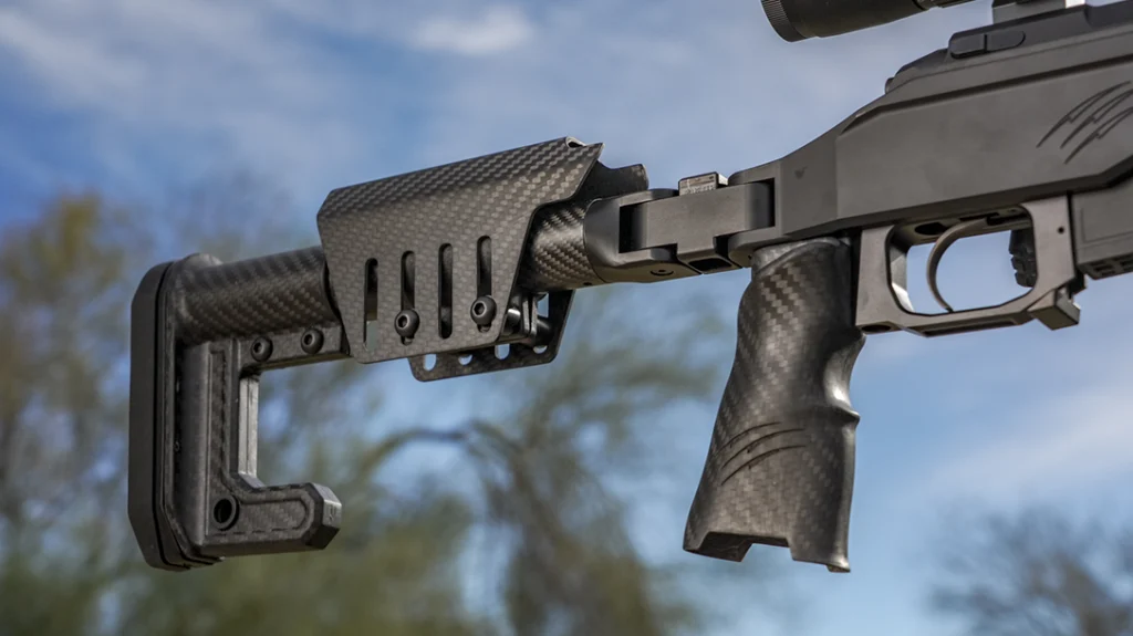 The main focus for me is the Fierce C3 carbon fiber chassis. This is what gave me the PRS rifle “feels” when I discovered it. Made of aluminum and carbon fiber it’s light and strong. The entire rifle, mine in a left-handed version of course, weighed 7 pounds on my scale. Quite impressive considering all the features it has.