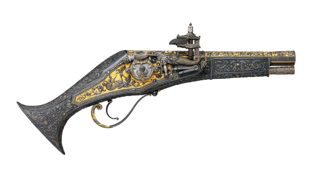 Wheellock firearms operate by spinning a steel wheel against a piece of pyrite, which creates sparks that pass through a small touchhole and ignite the gunpowder, firing a projectile. Thisignition system was popular from the early 16th to the 17th century and was commonly used by nobles, wealthy individuals, and cavalry units.