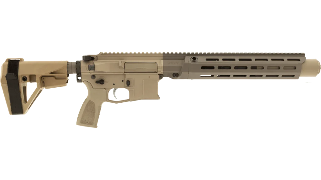 The SDX RFLX Pistol is also chambered in .300 BLK and features an 8.5-inch barrel. It comes in your choice of CQB (Gen:6 CQB Pistol Brace) or Carbine (SBA5 Pistol Brace) pistol braces. This AR Pistol features a full-length Picatinny top rail and uses Maxim’s 2-piece ledge handguard. The same ALG Combat trigger also comes installed on this gun. The RFLX suppressor is included with the pistol and is an over-the-barrel design as well.