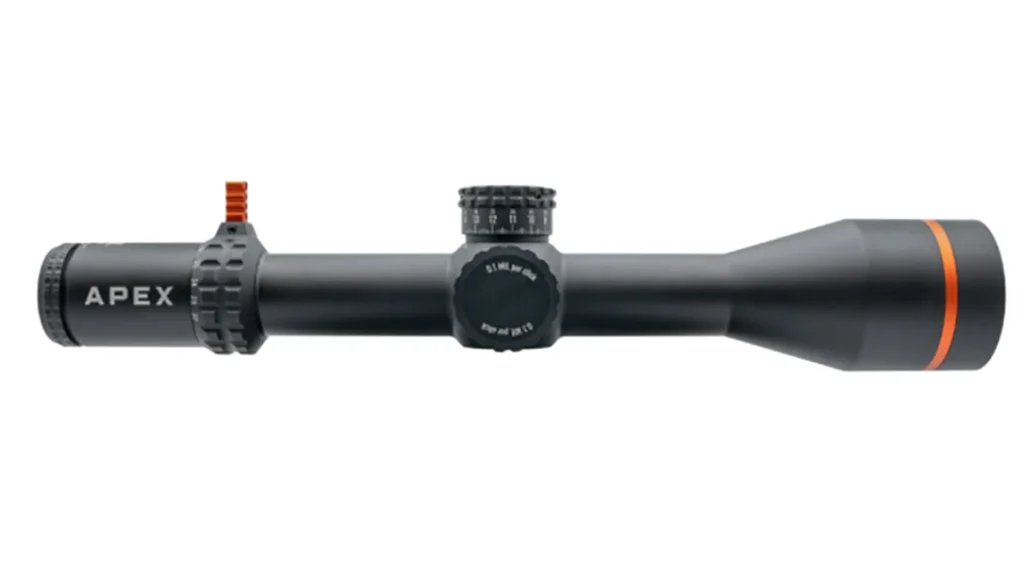 A high performance long range optic with a whopping 32 MIL of elevation adjustment. This new optic has 10 MIL (RivalX) and 15 MIL per turn elevation adjustment knobs giving you options. Prime ED APO glass with 99.7 light transmission ensures excellent picture in all lighting conditions. It also features a zero stop, fast focus eyepiece, and revolution indicator to help keep you on track. 34mm main tube and FFP plane. Tree-type CLR Reticle gives you plenty of options for wind and elevation holds.