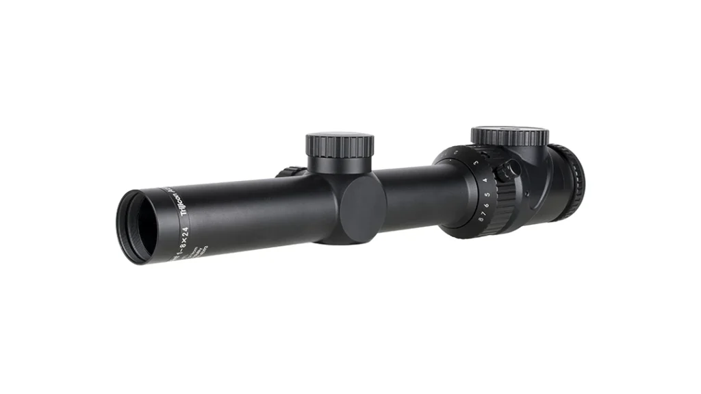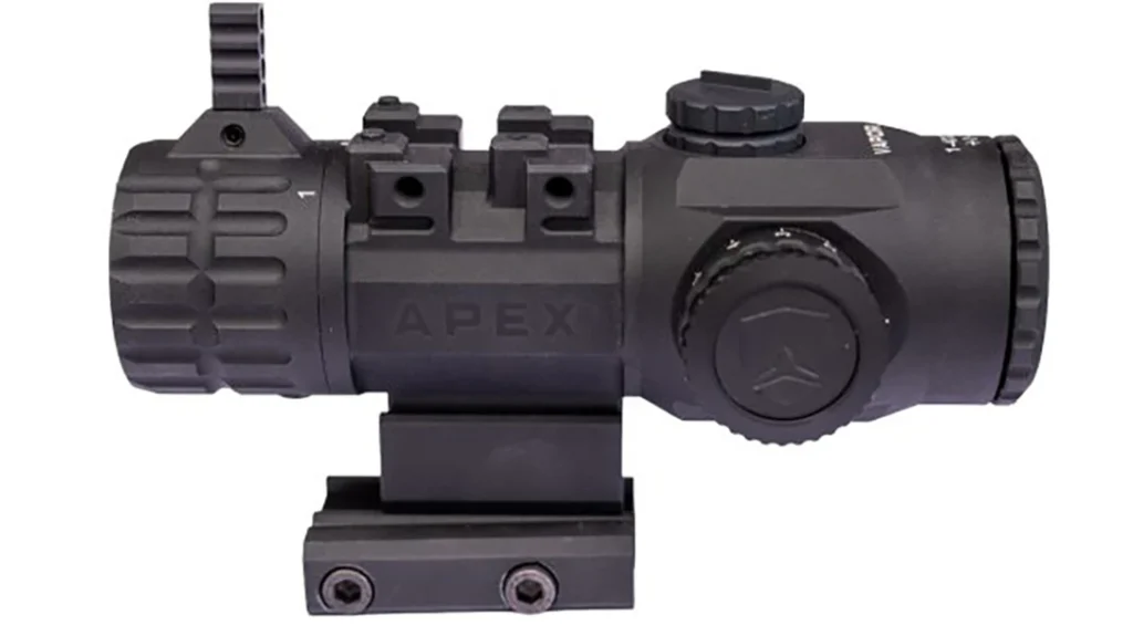 A 1-4×22 variable zoom prism sight that features prime ED glass, with an etched second focal plane reticle, inside a rugged body of 6061 T6 Aluminum. It quickly switches from 1x through 4x and had six brightness positions. Adjustability isn’t an issue with 80 MOA elevations and windage travel. Parallax free with Fire reticle.