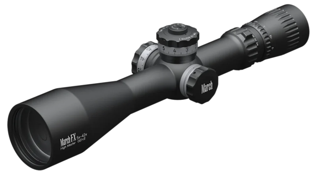 Premium, next level Japanese optics built to perform at the highest levels. With a long list of features catering to the PRS/NRL shooter: 5-42×56, FFP, zero set, with writable turrets and lockable side focus turret. 40 Mill of elevation travel. It also has 26 degrees field of view giving 30% more viewing area compared to standard models. There is one reticle in this model, the FML-WBR, a clean reticle with excellent markings.