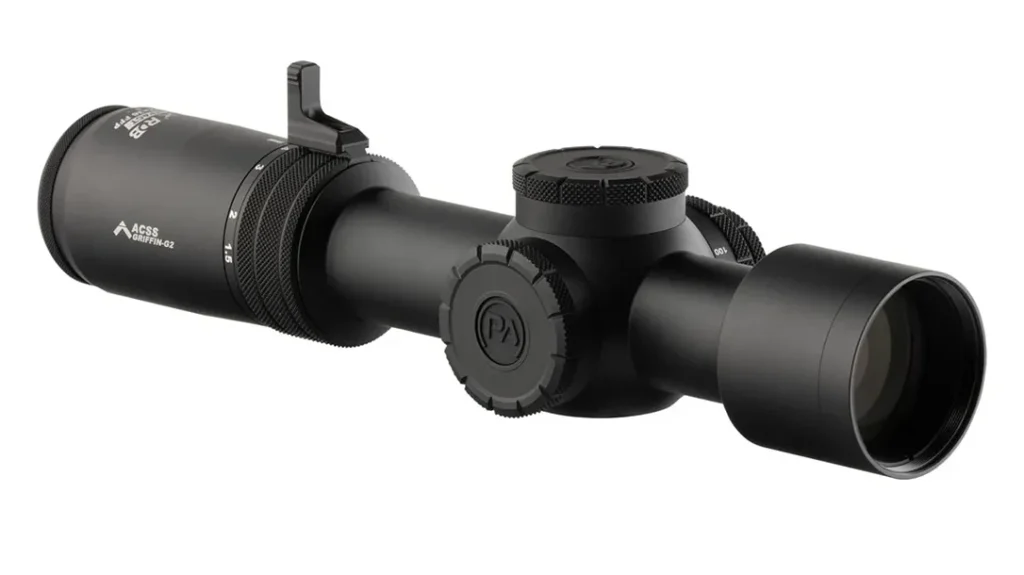 Built on PA’s 30mm PLx chassis This is a new and compact optic with new magnification range. Ligher and smaller with Japanese Premier ED glass the image is clear with edge to edge sharpness and excellent color fidelity. First focal plane reticle, forgiving eyebox and interchangeable elevation turret round out a massive amount of features on a compact reticle to be used by competitors and hunters alike.